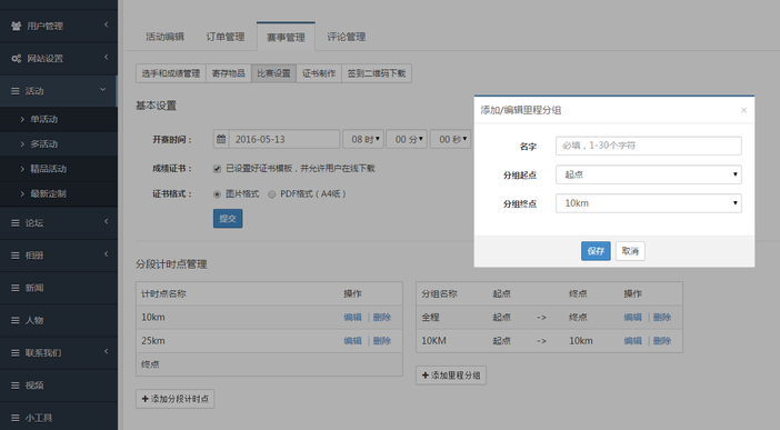 4.针对赛事网站,后台赛事管理添加里程管理,可设置里程分组起点和终点。(针对赛事不同起点)