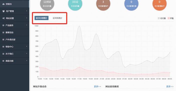 2.系统后台新增流量数据统计曲线表,分天统计量和月统计量,方便亲们直观的统计网站流量情况: