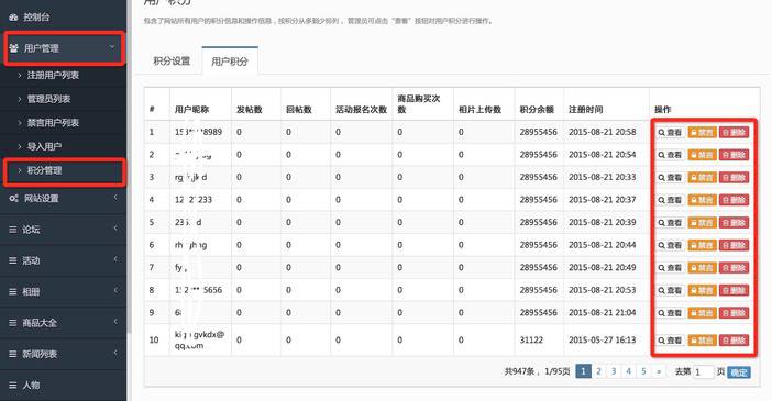 系统新增用户积分管理菜单,方便管理员对网站用户积分进行统一管理: