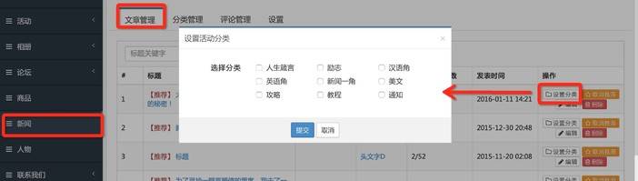 1.系统后台文章新增分类管理功能,方便用户搜索以及管理员管理网站的文章。