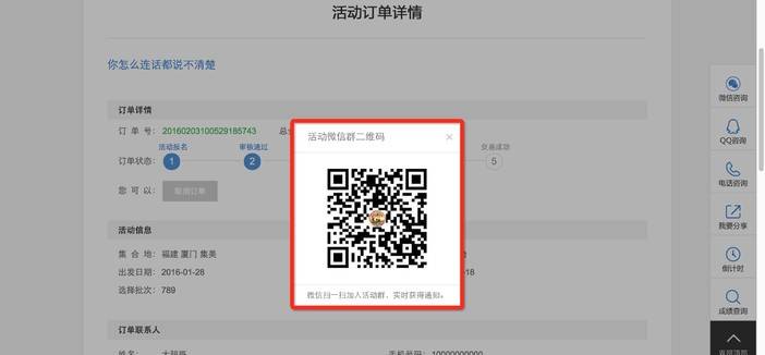 1.系统后台新增活动群二维码分享功能,活动报名成功后自动弹出群二维码,即可分享至微信群。