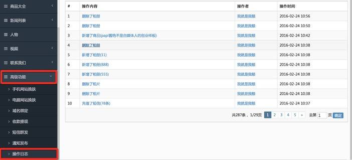 系统后台新增查看操作日志功能,亲们在自己网站的所有操作均会在此处显示,点击即可查看操作详情。