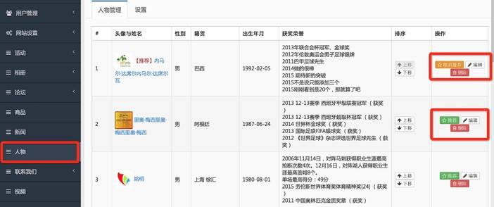 系统后台人物新增推荐功能,可以将优秀人物直接推荐至首页显示。