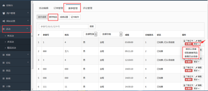 2.付费版赛事系统后台活动赛事管理中新增寄存物品以及赛事物品领取功能。