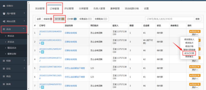 2.网站后台单个活动待付款订单【更多】操作中新增【设为已付款】功能。