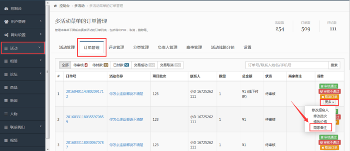 3.网站后台活动订单管理【更多】操作中新增【商家备注】功能。