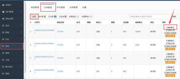 4.网站后台商品订单管理【更多】操作中新增【商家备注】功能。