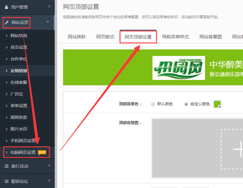 2.点击顶部背景图,可上传适当尺寸的图片作为网站顶部的背景图。