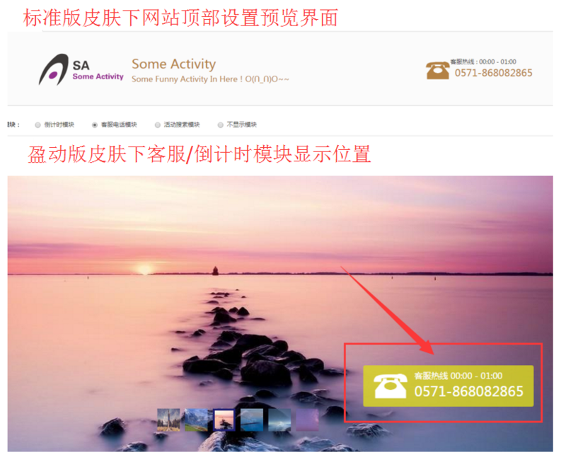 PS:在标准版皮肤下,进行网页顶部设置时,会显示顶部预览图。在盈动版皮肤下,不会显示预览图,两个模块的显示位置在焦点轮播图的右下方位置
