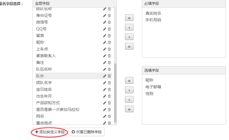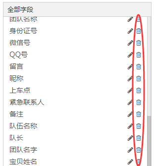 对于已经在其他活动的必填字段或者选填字段内的报名字段,允许删除,再移到全部字段列表之后就不会显示。