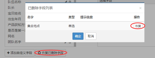 :点击【恢复已删除字段】按钮,选择需要恢复的字段,点击【恢复】按钮即可。