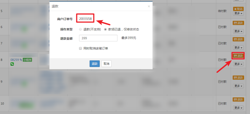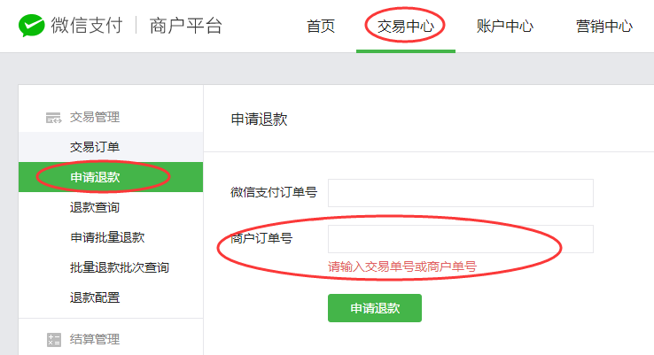 微信支付订单号也可操作退款,需用户提供。(在微信支付后的微信支付凭证处获得)