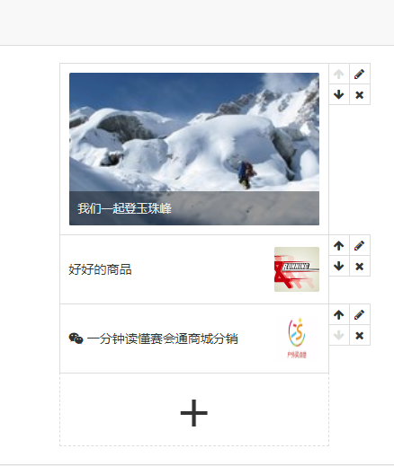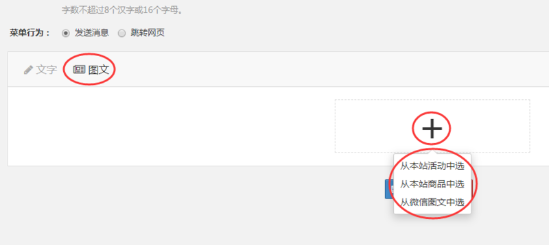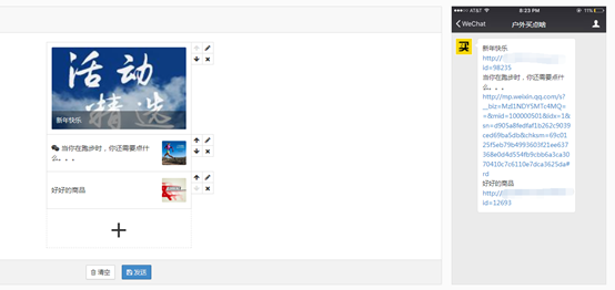 选择需要的内容,微信图文、网站商品和网站活动内容可以自动混合在图文消息内。