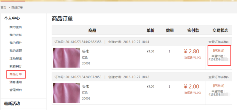 用户从【个人中心】-【商品订单】处进入查看订单状态,可以看到单号信息,并且点击【查看订单详情】可以查看到物流的配送状态。
