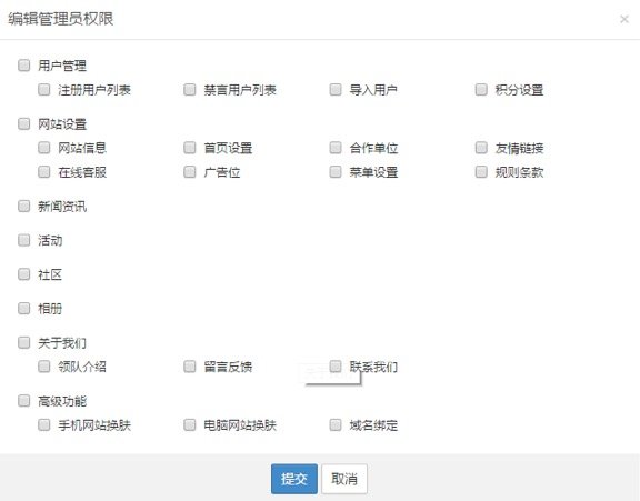 编辑管理权限:选择完成每条权限后,该管理员进入后台后可以进行相关操作,没有给予的权限设置则不予显示。
