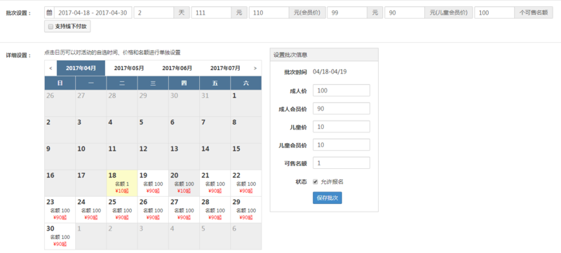 对成人价及儿童价进行分别设置,同时设置的批次的可售名额是成人与儿童报名数的总和。