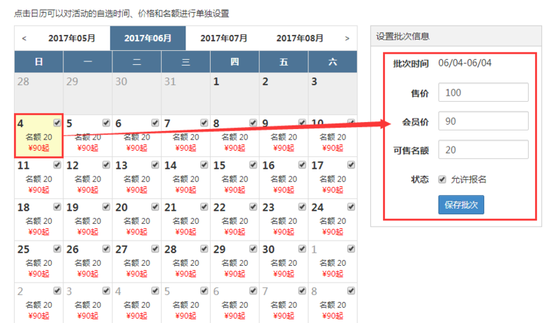 3.设置好价格之后,下方的日历时间内会统一显示对应的价格等信息。如果需要修改某个起始日期的信息,可以单独点击日历显示里的时间,点击右侧的【设置批次信息】进行修改。同时如果该天不允许报名也可以把该日下的【允许报名】的勾选去掉,操作完毕后,点击【保存批次】即可。