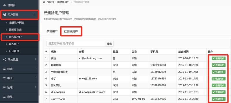 之前提供的删除用户的功能后,我们想到可能由于误删会导致一些误会产生,于是我们就将这个功能给完美优化啦,提供了恢复已删除用户的功能,就在后台的用户管理页面哦,亲们只需要一键,就可以将该用户的数据恢复过来了哦,O(∩_∩)O哈哈~