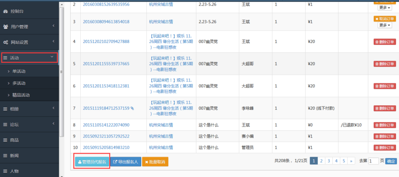 在单个活动订单管理中左下侧存在管理员代报名按钮。