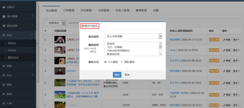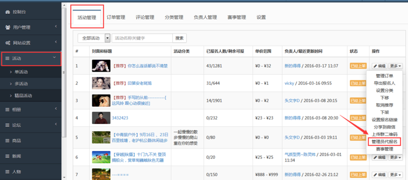 另外,在多活动下的活动管理单个活动中的更多选项中也存在管理员代报名按钮。