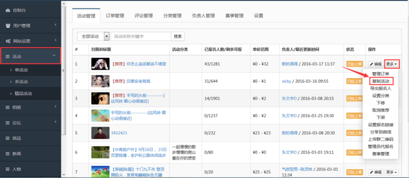 网站后台活动下的单个活动更多操作中新增复制活动功能。管理员可以利用原有活动模板创建新的活动。