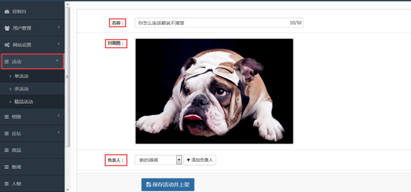 点击复制活动,管理员可以执行输入新活动的名称,上传活动的封面图,添加联系人等操作,最后点击保存新活动并上架按钮,即可创建新活动。