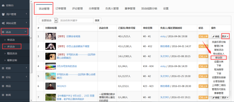 在活动下点击“多活动”,点击“活动管理”进入活动管理页面。点击“更多”操作,可以看到“移动到”功能按钮。