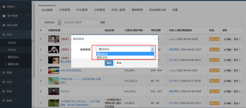 点击“移动到”,会弹出除本活动名称的以外的多活动名称,选择您要将文章移动到的多活动版块。点击“确定”,即可将此活动移动到其他版块。