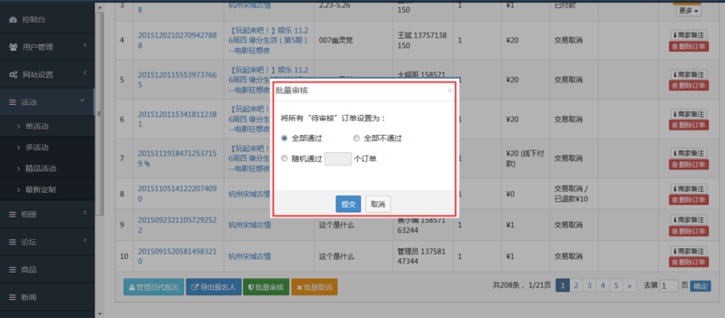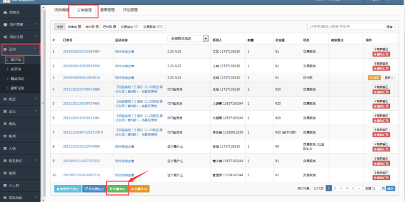 在活动下点击“单活动”,点击“订单管理”进入订单管理页面。在订单管理的最底部可以看到“批量审核”功能按钮。