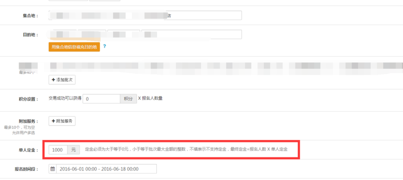 2.在后台活动编辑页中,创建或编辑活动页的单人定金栏中,可以对您希望用户预付定金的金额进行设置哦~~