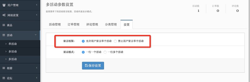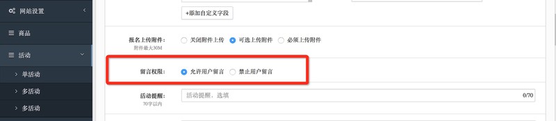 2.多活动,多活动的评论权限大于单活动的评论权限,如图处设置“允许用户留言”后,才可以设置单活动设置是否允许评论,若设为“禁止用户留言”,则所有单活动均不能留言:
