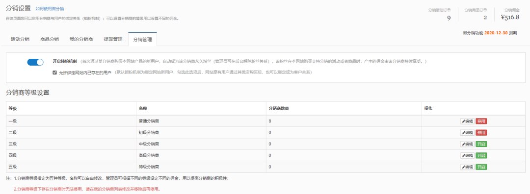 微分销2.0现已上线,支持锁粉功能,并支持多个分销商等级,并对多处微分销管理功能进行了调整优化。如何开启微分销锁粉功能?在【高级功能】-【微分销】-【分销管理】中开启【开启锁粉机制】开关,当有新用户在某分销商微店页面报名参加活动或购买商品后,该用户将与该分销商永久绑定粉丝关系。开启【允许绑定网站内已存在的用户】开关,当老用户(无绑定任何微店)在某分销商微店页面报名参加活动或购买商品后,该用户将与该分...