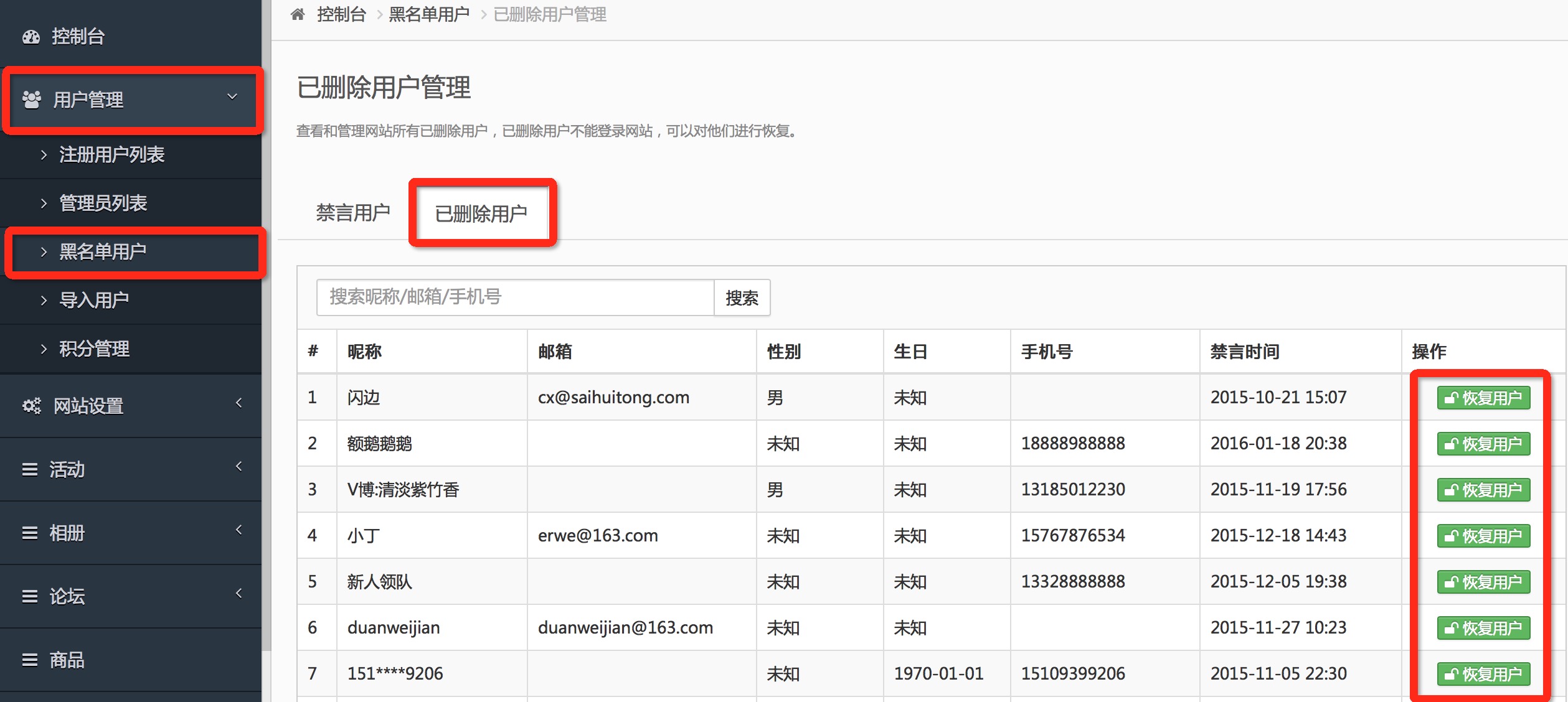 之前提供的删除用户的功能后,我们想到可能由于误删会导致一些误会产生,于是我们就将这个功能给完美优化啦,提供了恢复已删除用户的功能,就在后台的用户管理页面哦,亲们只需要一键,就可以将该用户的数据恢复过来了哦,O(∩_∩)O哈哈~...